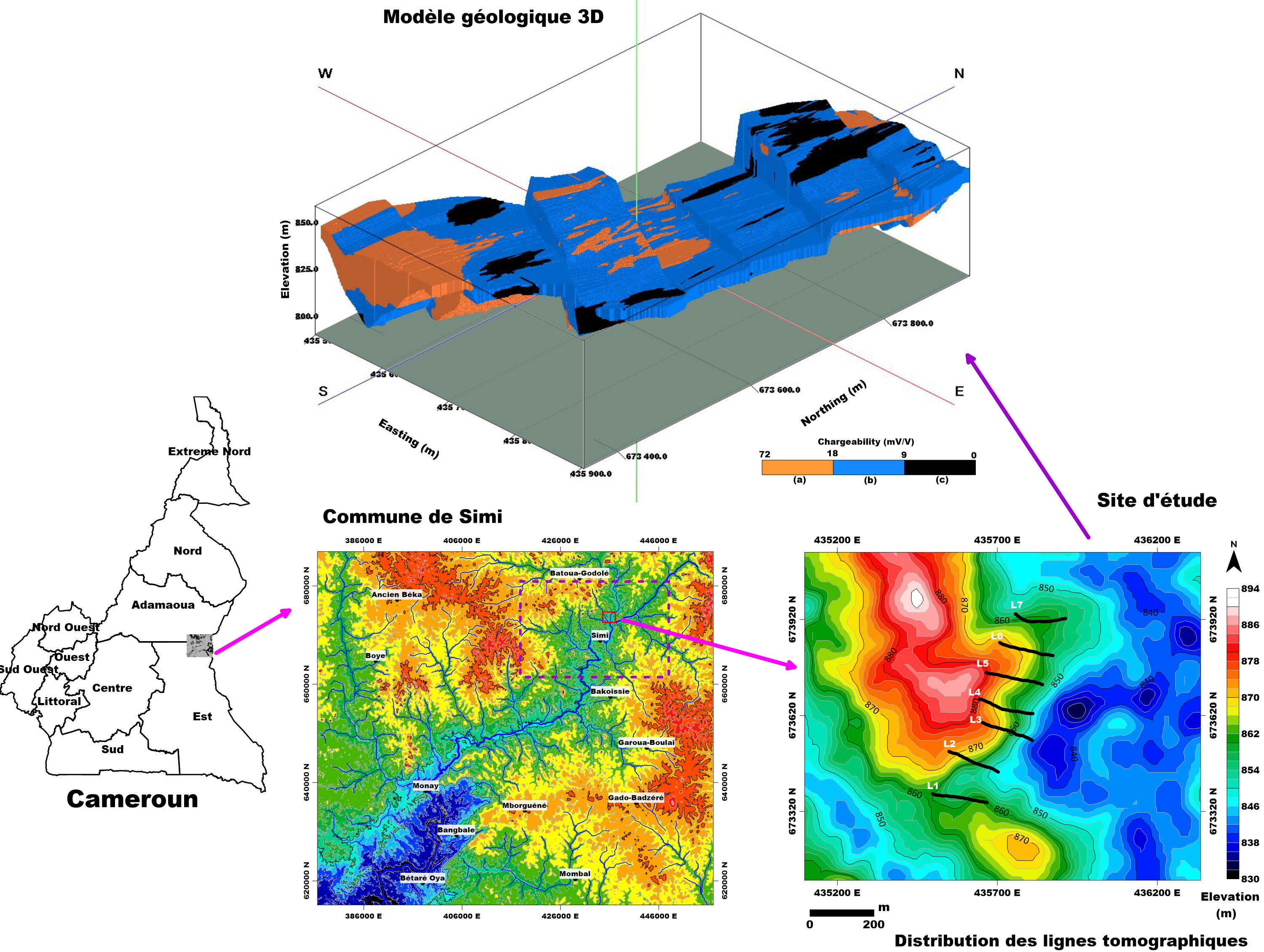 Ndam Njikam, M.M., Yem, M., Meying, A., Ribodetti, A., Messi, G., Tethys‐Authie, C.C., Zoumanigui, J.M., 2023. Combined analysis of resistivity and induced polarization tomography for 3D modelling and preliminary volume estimation of the possible gold mineralization zones in the Simi locality, Adamawa, Cameroon. Geophys. Prospect. 71, 749–764. https://doi.org/10.1111/1365-2478.13343